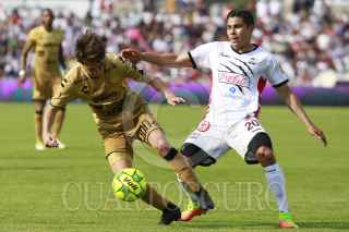 PUEBLA, PUEBLA, 13MAYO2017.- Los jugadores Jesús Angulo y Luis Pérez durante jugada del partido en que los Lobos BUAP derrotaron 1-0 a su similar Dorados de Sinaloa en partido correspondiente a la final de ida por el ascenso a la Liga MX en el estadio Universitario de la BUAP. FOTO: HILDA RÍOS / CUARTOSCURO.COM
