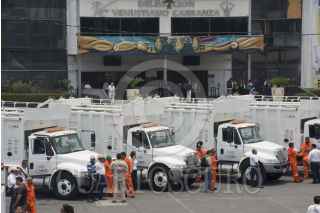 CIUDAD DE MÉXICO, 15MAYO2017.- Israel Moreno Rivera, jefe delegacional de Venustiano Carranza, encabezó el banderazo de salida de 15 nuevos camiones recolectores de basura. Cada camión cuenta con una capacidad de 8 a 10 toneladas, además de compartimientos para la separación de desechos inorgánicos y orgánicos. El servicio de estos camiones para las colonias Jardín Balbuena, Moctezuma 2ª Sección, Romero Rubio, Damián Carmona, Pensador Mexicano, Magdalena Mixiuhca, Morelos, Arenal 2ª Sección, Ampliación Simón Bolívar, Simón Bolívar, Popular Rastro e Ignacio Zaragoza. FOTO: MARIO JASSO /CUARTOSCURO.COM