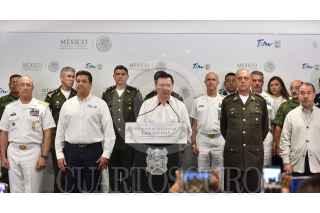 REYNOSA, TAMAULIPAS, 15MAYO2017.- Renato Sales, Comisionado Nacional de Seguridad; Vidal Francisco Soberón, secretario de Marina; Francisco García de Vaca, gobernador de la entidad; Miguel Ángel Osorio Chong, secretario de Gobernación; Salvador Cienfuegos, secretario de la Defensa y Raúl Cervántes Andrade, Procurador General de la República, ofrecieron una conferencia de prensa tras concluir una reunión en la que analizó la estrategia de seguridad para el estado. FOTO: SEGOB /CUARTOSCURO.COM