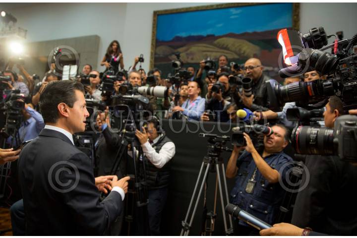 CIUDAD DE MÉXICO, 17MAYO2017.- El Presidente Enrique Peña Nieto encabezó la reunión extraordinaria de la CONAGO en la que se anunciaron distintas acciones por la libertad de expresión y para la protección de periodistas y defensores; ahí reafirmó su compromiso de que la muerte de periodistas no quede impune y se encuentre a los responsables. En la imagen saluda al presidente de la Comisión Nacional de Derechos Humanos, Luis Raúl González Pérez. FOTO: PRESIDENCIA /CUARTOSCURO.COM