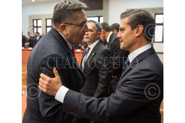 CIUDAD DE MÉXICO, 17MAYO2017.- El Presidente Enrique Peña Nieto encabezó la reunión extraordinaria de la CONAGO en la que se anunciaron distintas acciones por la libertad de expresión y para la protección de periodistas y defensores; ahí reafirmó su compromiso de que la muerte de periodistas no quede impune y se encuentre a los responsables. En la imagen saluda al presidente de la Comisión Nacional de Derechos Humanos, Luis Raúl González Pérez. FOTO: PRESIDENCIA /CUARTOSCURO.COM