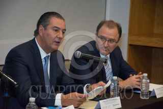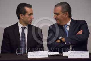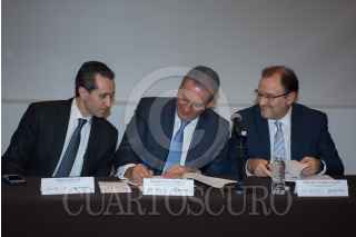 CIUDAD DE MÉXICO, 17MAYO2017.- Gerardo Gutiérrez, titular de la Autoridad para el Desarrollo de las zonas Económicas Especiales (AFDZEE); Jorge Familiar, vicepresidente del Banco Mundial, y Gerardo Corrochano, director del banco para Colombia, México, Latinoamérica y el Caribe, durante la Firma de convenio del Banco Mundial con la AFDZEE, el cual establece los puntos de viabilidad en zonas especiales, creación de bases institucionales, mejora en la eficiencia de distribución, marco regulatorio y estrategias de vínculos con proveedores. FOTO: MARIO JASSO /CUARTOSCURO.COM