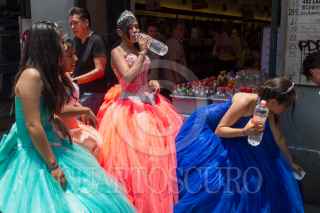 CIUDAD DE MÉXICO, 21MAYO2017.- Cuatro quinceañeras mitigan el calor con agua en la calle de Madero, en el Centro Histórico. FOTO: MOISÉS PABLO /CUARTOSCURO.COM