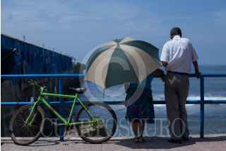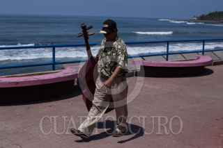 LA LIBERTAD, EL SALVADOR, 22MAYO2017.- Un hombre en compañía de su violonchelo camina por la playa de San Blas. La libertad es un departamento del país y su capital es la ciudad de Santa Tecla. Tiene una extensión territorial de 112 km² y una población de 121,908 habitantes. FOTO: ADOLFO VLADIMIR /CUARTOSCURO.COM