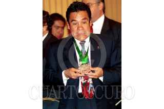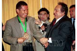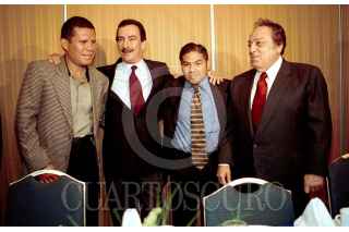 Julio César Chávez, Carlos Salomon, Humberto "La Chiquita" Gonzalez y Jose Sulaiman durante la firma de convenio entre la Loteria Nacional y el Consejo Mundial de Boxeo. FOTO: Victoria Valtierra/CUARTOSCURO
