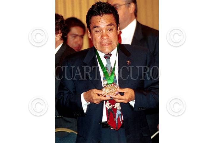 Julio César Chávez, Carlos Salomon, Humberto "La Chiquita" Gonzalez y Jose Sulaiman durante la firma de convenio entre la Loteria Nacional y el Consejo Mundial de Boxeo. FOTO: Victoria Valtierra/CUARTOSCURO