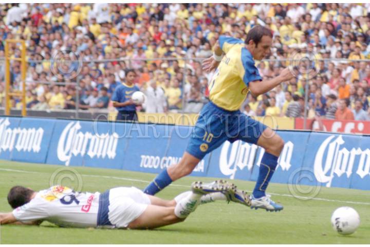 México, D. F. 27MARZO2004.- Las Águilas del América cayeron 2 goles a 1 ante los Tuzos de Pachuca en el juego de la jornada 12 del torneo de clausura 2004 en el estadio azteca. En la gráfica Cuauhtemoc Blanco (américa) y Manuel Vidrio (Pachuca). FOTO: Iván Stephens/CUARTOSCURO.COM