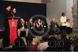 ZACATECAS, ZACATECAS, 26MAYO2017.- El Gobernador del Estado de Zacatecas Alejandro Tello inauguró ayer la Feria Nacional del Libro de Zacatecas 2017 en el ex templo de San Agustín, y en la Fototeca de Zacatecas la exposición “Las imágenes de la palabra”, del fotoperiodista Pedro Valtierra, que consta de 33 retratos a personajes de la literatura que el fotógrafo captó durante su larga trayectoria. Al evento asistieron poetas, novelistas, ensayistas, narradores, periodistas y escritores de todos los géneros literarios, tanto locales como nacionales e internacionales. FOTO: CARLOS SEGURA /CUARTOSCURO.COM