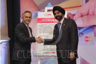 CIUDAD DE MÉXICO, 26MAYO2017.- Miguel Ángel Mancera, jefe de Gobierno, y Antonio Junco Goicoechea, presidente y director general de Mastercard para México, firmaron el convenio para impulsar la competitiva y productividad de los pequeños negocios, para que sean incorporados al sistema de pago electrónico, y puedan incrementar sus ventas. FOTO: CORTESÍA CDMX /CUARTOSCURO.COM
