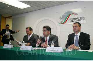 México, D. F. 30 Marzo 2004.- En conferencia de prensa Socrátes Campos, Jóse Luis Santiago y Gerardo Gracía Luna, director de la AFI informaron que la Procuraduría General de Justicia (PGR) vía la Secretaría de Relaciones Exteriores solicitará la extradición de Carlos Agustín Ahumada Kurtz por el delito de fraude genérico en agravio del gobierno del Distrito Federal. FOTO: Nelly Salas/CUARTOSCURO.COM