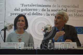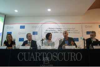 CIUDAD DE MÉXICO, 31MAYO2017.- Saskia Niño de Rivera, presidenta de Reinserta un Mexicano, Alberto Begné, subsecretario de prevención del delito y participación ciudadana en la SecretarÍa de Gobernación, Edna Jaime, directora general de México Evalua, Juan Garay, jefe de la sección de coperación de la Delegación de la Unión Europea en México, y Jonathan Furszyfer, coordinador del programa de seguridad en México Evalúa, presentaron los resultados del programa "Fortalecimiento de la capacidad del gobierno y de la sociedad civil para prevenir el delito y la violencia en México", el cuál es apoyado por la Unión Europea y pretende rescatar los espacios públicos en zonas con altos índices delictivos, así como la prevención del delito en zonas vulnerables. Del programa se becaron a jóvenes que se capacitaron para el empleo y a adolescentes embarazadas para continuar sus estudios. FOTO: SELENE PACHECO /CUARTOSCURO.COM