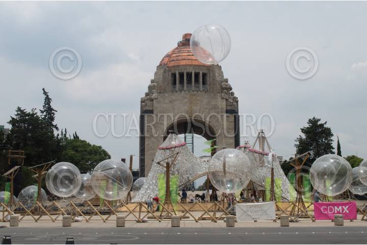 CIUDAD DE MÉXICO, 31MAYO2017.-Un pabellón del arquitecto Francisco Erazo, se instala frente al Monumento a la Revolución. La obra "Caracol de viento" se trata de una estructura que combina me- dios naturales e industriales como columnas de bambú con conexiones de acero. FOTO: SELENE PACHECO /CUARTOSCURO.COM