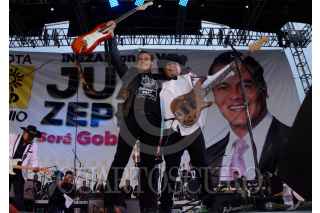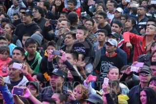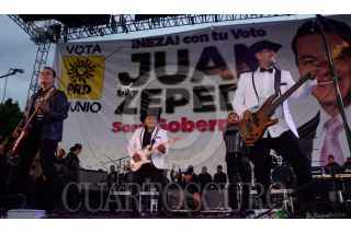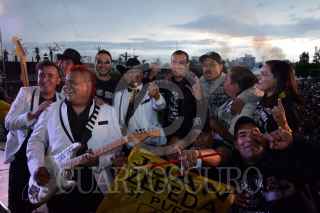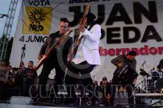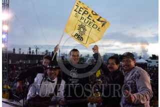 CIUDAD DE MÉXICO, 31MAYO2017.- Juan Zepeda, candidato a la gubernatura del Estado de México, durante su visita y participación en el concierto de bandas de rock nacional organizado como parte de su cierre de campaña en la explanada de la delegación de Nezahualcóyotl. En la imagen, Zepeda posa para la foto con los integrantes de la banda "Tex Tex". FOTO: MARIO JASSO /CUARTOSCURO.COM