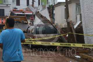 VILLAHERMOSA, TABASCO, 01JUNIO2017.- Las fuertes lluvias que iniciaron anoche provocaron que la barda de un costado del cementerio Central cayera sobre un vehículo. Por su parte la Coordinación Estatal de Protección Civil informa que la lluvia provocó inundaciones hasta de 60 centímetros en varias colonias y se tuvieron que suspender clases en 12 escuelas por encontrarse inundadas. FOTO: MARCO POLO GUZMÁN HERNÁNDEZ /CUARTOSCURO.COM