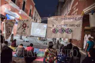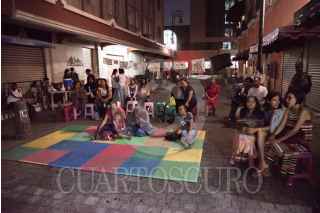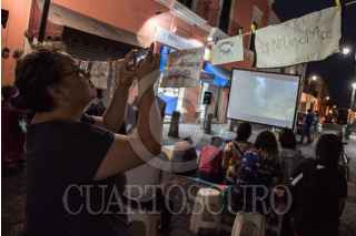 TEPIC, NAYARIT, 01JUNIO2017.- El colectivo ProyectoR, conformado por varios jóvenes, han estado realizando muestras de cine con el título "Sufragio Efectivo No Imposición", ademas de foros de análisis electoral en el marco de las candidaturas a la gubernatura del estado. Asimismo, han realizado instalaciones de bordados con la temática de los feminicidios con el propósito de visibilizar la violencia de género. Cabe mencionar que las proyecciones se llevan acabo en la calle Sebastián Lerdo de Tejada, sitio que durante la administración de Manuel Cota Jiménez (2005-2008), se gastó parte del erario público para acondicionarlo como un espacio peatonal, sin embargo, debido a que continuó hasta la fecha el transito de automóviles, la propuesto cultural del colectivo es también un intento por la recuperación de los espacios públicos. FOTO: TERCERO DÍAZ /CUARTOSCURO.COM
