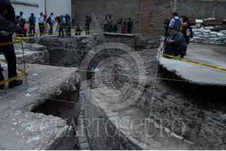 CIUDAD DE MÉXICO, 07JUNIO2017.- Investigadores del Instituto Nacional de Antropología (INAH) anunciaron el hallazgo del templo de Ehécatl y un juego de pelota en un predio particular localizado en la calle de Guatemala en el Centro Histórico, el descubrimiento concuerda con la ubicación proporcionada por las crónicas de los frailes del siglo XVI. Se espera que en el lugar sea construido un museo de sitio para ser abierto al público. FOTO: SELENE PACHECO /CUARTOSCURO.COM