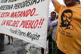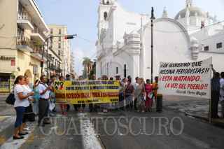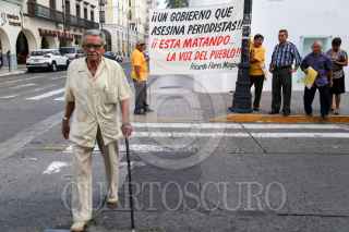 VERACRUZ, VERACRUZ, 07JUNIO2017.- Ciudadanos y maestros jubilados cerraron la avenida Independencia para realizar un posicionamiento en el Día de la Libertad de Expresión, el cual consistió en exigir a las autoridades que se garantice la seguridad en el ejercicio periodístico. Además leyeron un texto dedicado a los profesionales de la comunicación y afirmaron que gracias a esta labor, su lucha como muchas otras no terminarán en el olvido. FOTO: ILSE HUESCA /CUARTOSCURO.COM
