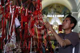 PUEBLA, PUEBLA, 13JUNIO2017.- Creyentes, en su mayoría mujeres acuden a la iglesia de San Antonio de Padua en donde le colocan veladoras y listones rojos para pedir novio o favores amorosos al santo católico. FOTO: HILDA RIOS /CUARTOSCURO.COM