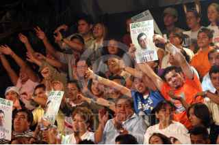 México, D.F., 25ABRIL2004.- La conductora Veronica Castro manda besos a los habitantes de la casa de Big Brother, en este domingo de expulsión. FOTO: Moisés Pablo/CUARTOSCURO.COM