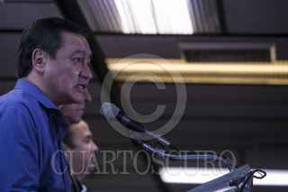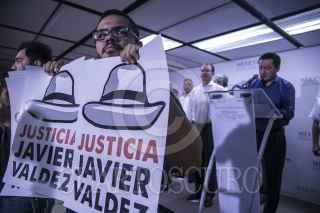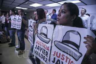CULIACAN, SINALOA, 20JUNIO2017.- El Secretario de Gobernación Miguel Angel Osorio Chong en compañia de Quirino Ordaz Coppel gobernador del Estado y Salvador Cienfuegos, Secretario de la Defensa Nacional de México, encabezaron una conferencia de prensa donde se trataron principalmente temas de seguridad, durante el evento un grupo de periodistas se manifestarón para exigir justicia por el asesinato del periodista Javier Valdez. FOTO: RASHIDE FRIAS /CUARTOSCURO