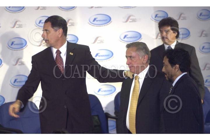 México D.F 27 Abril 2004.- El presidente Vicente Fox saluda a Arcenio Díaz Escalante, director del FONACOT al término de la ceremonia de aniversario de su creación. FOTO: Eunice Adorno/CUARTOSCURO.COM