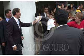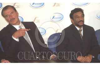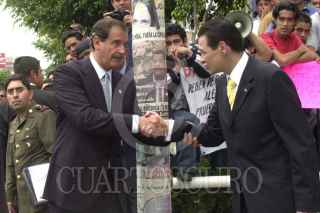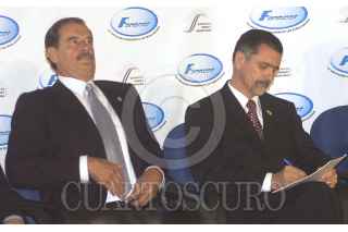 México D.F 27 Abril 2004.- El presidente Vicente Fox saluda a Arcenio Díaz Escalante, director del FONACOT al término de la ceremonia de aniversario de su creación. FOTO: Eunice Adorno/CUARTOSCURO.COM