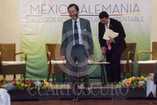 CIUDAD DE MÉXICO, 21JUNIO2017.- Viktor Elbling, embajador de Alemania en México, y Carlos Mena, asesor de presidencia del Centro Mario Molina, durante la inauguración del foto público “Diálogos por un futuro sustentable México-Alemania”. El dialogo giro en torno a la Reforma enérgetica, los retos y oportunidades de la transición energética en la reducción de emisión es de gases de efecto invernadero en los sectores que mayor contribuyen en México: la eléctrica y de transporte. FOTO: MARIO JASSO /CUARTOSCURO.COM