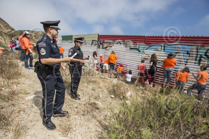 TIJUANA, BAJA CALIFORNIA, 25JUNIO2017.- Con la intención de difundir mensajes positivos de la frontera a través del arte, medio centenar de personas acudieron al muro fronterizo para pintarlo de blanco como parte del proyecto “El mural de la hermandad”. Lo que permitirá que artistas locales puedan plasmar en la laminas de metal que forman al muro sus pinturas con mensajes de paz, esperanza y el significado de la frontera. También participaron elementos de la Policía Federal, así como instituciones municipales de gobierno. FOTO: CHRISTIAN SERNA /CUARTOSCURO.COM