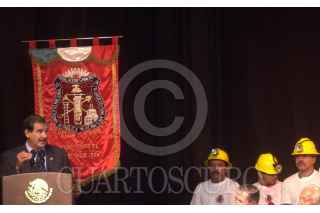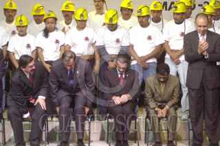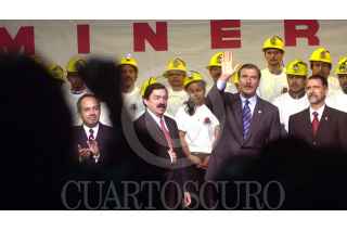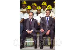México D.F 04 Mayo 2004.- Felipe Calderon Hinojosa, secretario de Energía, Napoleón Gómez, secretario general de trabajadores mineros y el presidente Vicente Fox durante la ceremonia de apertura de la XXXIII Convención General del Sindicato de Trabajadores Mineros y Metalurgicos. FOTO: Eunice Adorno/CUARTOSCURO.COM