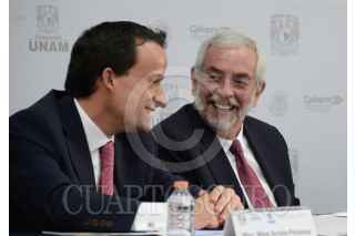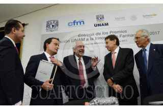 CIUDAD DE MÉXICO, 27JUNIO2017.- Enrique Graue Wiechers, el rector de la UNAM entregó premios a seis proyectos (presentados en forma de tesis: tres de licenciatura y tres de posgrado), acompañado del director general del IMSS, Mikel Arriola; el titular de la Cofepris, Julio Sánchez y Tépoz; el presidente del Consejo Farmacéutico Mexicano (CFM), Alfredo Rimoch, así como del presidente del Consejo Directivo de Fundación UNAM, Dionisio Meade. A fin de estimular la investigación y los proyectos innovadores de jóvenes académicos en las ciencias de la salud, la UNAM, la Comisión Federal para la Protección de Riesgos Sanitarios (Cofepris) y Fundación UNAM entregaron el Premio a la Innovación Farmacéutica y Dispositivos para la Salud 2017. FOTO: UNAM /CUARTOSCURO.COM