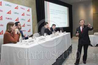 CIUDAD DE MÉXICO, 28JUNIO2017.- Francisco Larrondobuno, gerente de Marca y Comunicación para Chinoin (laboratorio mexicano farmaceutico) ; César García Granados, jefe de producto para Chinoin; Sandra Hagsater, directora de marketing, y los médicos José Luis Sánchez Mejía y Gabriel Tona, durante la presentación de los dos nuevos medicamentos de este laboratorio mexicano., para el tratamiento de la rinitis y el dolor neuropático, los cuales se suman a la cartera de opciones terapéuticas a nivel nacional. FOTO: MARIO JASSO /CUARTOSCURO.COM