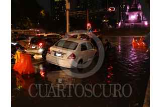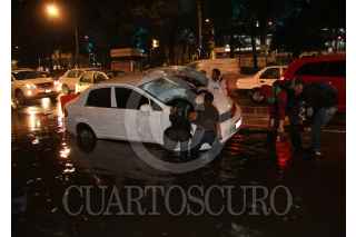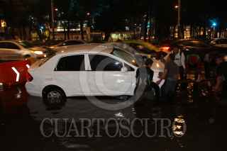CIUDAD DE MÉXICO, 28JUNIO2017.- Debido al fuerte tromba que callo esta tarde en la Ciudad de México, un automovilista cayó en una de las zanjas de la construcción de la línea 7 del metrobus en Paseo de la Reforma y Florencia. FOTO: ANTONIO CRUZ /CUARTOSCURO.COM