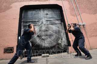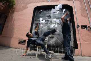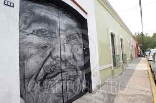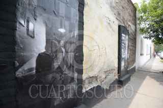 TOLUCA, ESTADO DE MÉXICO, 04JULIO2017.- Fernando Castillón Cuevas y Juan Manuel García Villaseñor, dos artistas que buscan cambiar la cara de la ciudad interviniendo las fachadas olvidadas y con falta de mantenimiento en la calle Leona Vicario, en la ciudad de Toluca, empleando una técnica especial basada fotografías y fotocopias, con lo que realizan una especie de papel tapiz, temas como paisajes, rostros, actividades cotidianas son las que plasman en las fachadas para que los habitantes tenga otra vista de sus calles. FOTO: ARTEMIO GUERRA BAZ /CUARTOSCURO.COM
