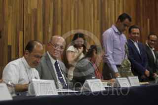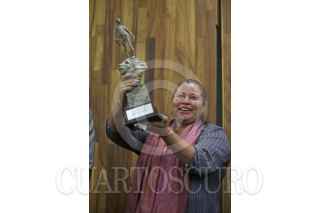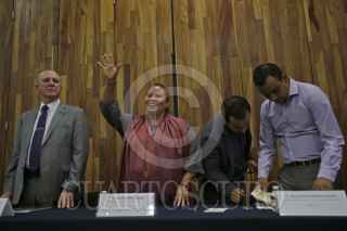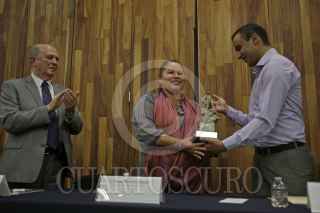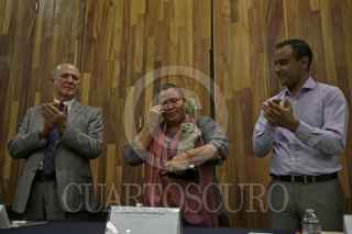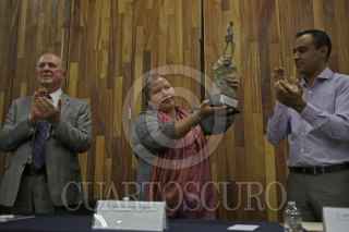 GUADALAJARA, JALISCO. 04JULIO2017.- Norma Romero Vázquez, dirigente de la asociación de nombre “Las Patronas” quien con poco mas de 23 años de proveer ayuda humanitaria a miles de migrantes en su travesía por el sueño americano, recibió esta tarde de manos del Presidente de la Federación de Estudiantes Universitarios FEU, Arturo Medina Varela, el Galardón Corazón de León; a dicho evento asistieron personalidades de la política local, así como estudiantiles y activistas como el Padre Alejandro Solalinde, quien al final en compañía del presídium firmaron un acuerdo de colaboración entre la FEU, Hospitales Civiles de Guadalajara y el Ayuntamiento de Zapopan para echar andar el proyecto de atención integral para migrantes durante su trayecto por México, dicho evento tuvo lugar en el Auditorio Salvador Allende del Centro Universitario de Ciencias Sociales y Humanidades de la U. De G. FOTO: FERNANDO CARRANZA GARCIA / CUARTOSCURO.COM