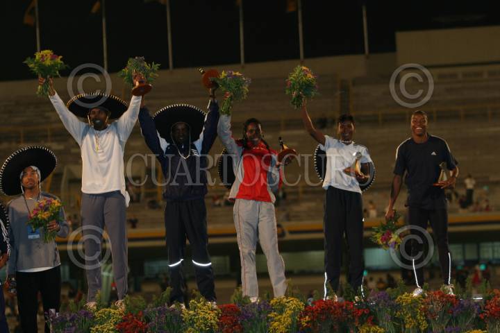 MEXDF22MAYO2004.- Allen Johnson de Estados Unidos celebra su triunfo en la prueba de los 110 metros altas del Gran Prix 2004. FOTO:Nelly Salas/CUARTOSCURO.COM