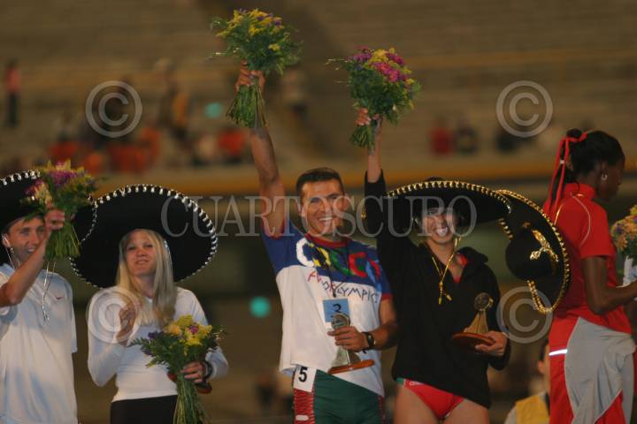 MEXDF22MAYO2004.- Allen Johnson de Estados Unidos celebra su triunfo en la prueba de los 110 metros altas del Gran Prix 2004. FOTO:Nelly Salas/CUARTOSCURO.COM