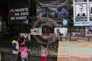 CIUDAD DE MÉXICO, 09JULIO2017.- Integrantes del colectivo Gran Simio realizaron una protesta a la entrada del Bosque de Chapultepec a un año de la muerte del gorila Bantú provocada por un falla en un procedimiento médico. Exigen justicia y el esclarecimiento del acontecimiento, asimismo llamaron a la sociedad civil a que se informaran y dejarán de ver los zoológicos como un acto de entretenimiento y los tomaran como lugares de sufrimiento para os animales. FOTO: GALO CAÑAS /CUARTOSCURO.COM