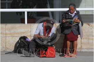 OAXACA, OAXACA, 11JULIO2017.- Un bolero lustra los zapatos de una señora quien espera aún costado leyendo una revista. FOTO: ARTURO PÉREZ ALFONSO/ CUARTOSCURO.COM