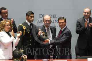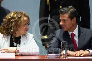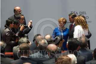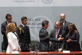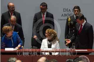 CIUDAD DE MÉXICO, 12JULIO2017.- Enrique Peña Nieto, Presidente de México, encabezó la celebración del Día del Abogado, en el Palacio Nacional. En la imagen se toma la foto con la ministra Margarita Luna Ramos y la diputada Sharom Cuenca, les toma la imagen el director del IMSS Mikel Arriola. FOTO: MOISÉS PABLO /CUARTOSCURO.COM