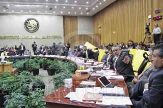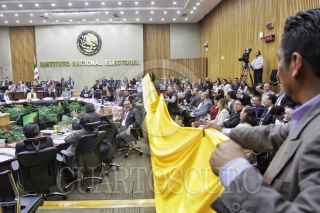 CIUDAD DE MÉXICO, 17JULIO2017.- Guadalupe Acosta Naranjo, representante del PRD ante el INE, mostró varios metros de tela que compró con 500 pesos, luego de que la unidad de fiscalización calculó mal el gasto que realizó ese partido en banderas, durante la continuación de la sesión del Consejo General del pasado viernes, en donde se discuten los topes de gastos de campaña de las elecciones de Estado de México, Nayarit y Coahuila. FOTO: ISAAC ESQUIVEL /CUARTOSCURO.COM