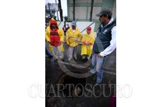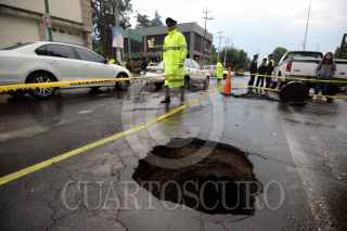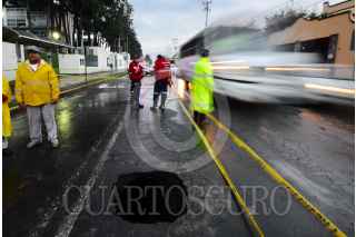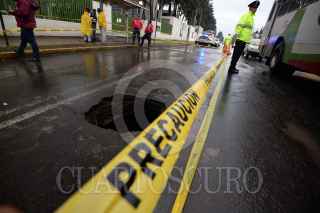TOLUCA, ESTADO DE MÉXICO, 17JULIO2017.- Las lluvias reblandecieron el pavimento de la avenida Jesús Carranza y se registró un hundimiento frente al Hospital Veterinario de Pequeñas Especies de la UAEM, personal de Protección Civil y del Organismo de Agua y Saneamiento acudieron al lugar para acordonar la zona y evitar algún accidente. FOTO: ARTEMIO GUERRA BAZ /CUARTOSCURO.COM