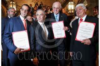 CIUDAD DE MÉXICO, 18JULIO2017.- Jesus Padilla, presidente de Coparmex, Humberto Lozano, presidente de Concanaco, Miguel Ángel Mancera, jefe de Gobierno local, durante la entrega de certificados ambientales a empresas comprometidas con el medio ambiente, en el antiguo palacio de gobierno. FOTO: ISAAC ESQUIVEL /CUARTOSCURO.COM