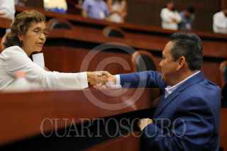 CHILPANCINGO, GUERRERO.25JULIO2017.-El diputado Héctor Vicario Castrejón del PRI saluda a María de Jesús Cisneros diputada por el Movimiento de Regeneración Nacional MORENA en la sesión del congreso del estado. FOTO: JOSÉ I. HERNÁNDEZ / CUARTOSCURO.COM