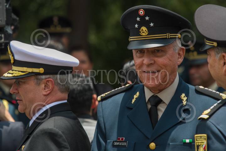 CIUDAD DE MÉXICO, 26JULIO2017.- Vidal Francisco Soberón Sanz, secretario de la Marina, y Salvador Cienfuegos, secretario de la Defensa, al terminar la ceremonia de entrega de menciones honoríficas y reconocimiento a unidades y persona del Ejército, Armada y Fuerza Aérea, en la explanada del Campo Militar no. 1-A. FOTO: MOISÉS PABLO /CUARTOSCURO.COM