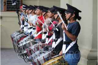 CHILPANCINGO, GUERRERO, 26JULIO2017.- La banda de guerra del Pentatlón ensayó en un pasillo del ayuntamiento de la entidad para evitar empaparse con el torrencial aguacero que azotó la ciudad. FOTO: JOSÉ I. HERNÁNDEZ /CUARTOSCURO.COM