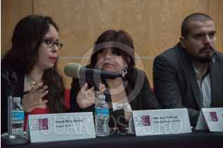 CIUDAD DE MÉXICO, 03AGOSTO2017.- María de la Luz Estrada, coordinadora Ejecutiva del Observatorio Ciudadano Nacional del Feminicidio (OCNF), Anayeli Pérez Garrido, abogada de OCNF, y Victor Chávez Cornejo, experto en criminalística, durante conferencia de prensa, para desmentir la resolución ofrecida por la la Procuraduría General de Justicia de la Ciudad de México (PGJCDMX) en el caso del fallecimiento de la joven Lesvy Berlín Rivera, en Ciudad Universitaria. Durante la conferencia, se mostró un video con recreación de los hechos,en donde se realizaron diversas pruebas para manifestar que no se puede tratar de un suicidio. FOTO: MARIO JASSO /CUARTOSCURO.COM