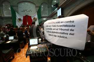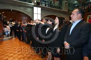 TOLUCA, ESTADO DE MÉXICO, 03JULIO2017.- Diputados de la LIX Legislatura local tomaron protesta a los magistrados que integrarán el Tribunal de Justicia Administrativa del Estado de México, especializados en materia administrativa para el nuevo sistema Anticorrupción, durante este acto los legisladores de MORENA sacaron pancartas en donde rechazaron este nombramiento. FOTO: ARTEMIO GUERRA BAZ /CUARTOSCURO.COM