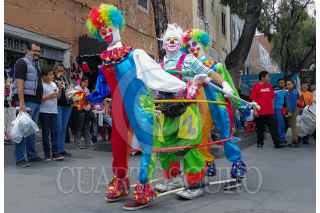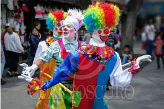 CIUDAD DE MÉXICO, 04AGOSTO2017.- Un payaso ofrece un espectáculo en el que dos muñecos, sincronizados con sus movimientos, acompañan su baile sobre Anillo de Circunvalación en la colonia Centro. FOTO: DIEGO SIMÓN SÁNCHEZ /CUARTOSCURO.COM