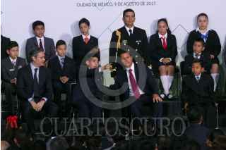 CIUDAD DE MÉXICO, 09AGOSTO2017.- Enrique Peña Nieto, Presidente de México, y Aurelio Nuño Mayer, secretario de Educación Pública (SEP), encabezaron la Convivencia Cultural 2017 a la cual acuden los niños con las mejores calificaciones del país, en la residencia oficial de Los Pinos. En la imagen el mandatario conversa con el niño Andrés Emiliano de la Garza Rosales del Estdo Coahuila, ganador del primer lugar en la Olimpiada Nacional del Conocimiento, FOTO: MOISÉS PABLO /CUARTOSCURO.COM