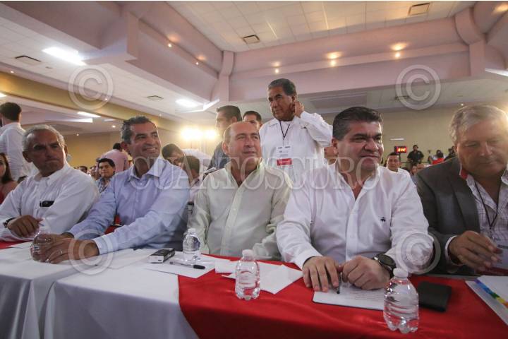 SALTILLO, COAHUILA, 09AGOSTO2017.- Enrique Ochoa Reza, dirigente nacional del PRI; Rubén Moreira, gobernador del estado; y Miguel Riquelme, gobernador electo de Coahuila, durante la mesa nacional temática "Declaración de Principios", a la víspera de la celebración de su Asamblea Nacional Ordinaria. FOTO: VENUSTIANO MADERO /CUARTOSCURO.COM